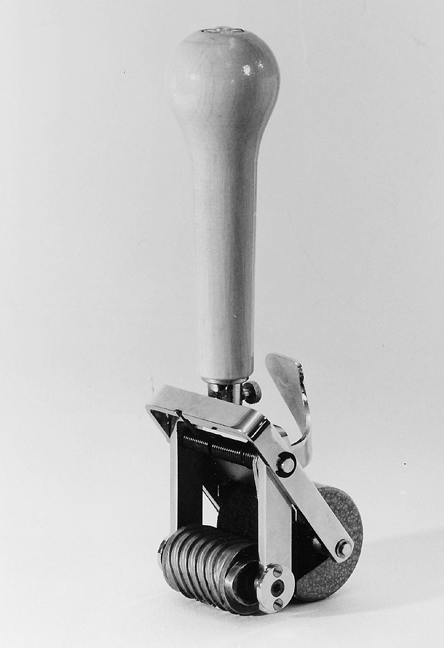 Datumstämpel, handrullstämpel av metall, med handtag av trä. Lämnar