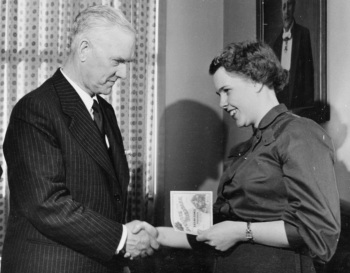 Postsparbankschefen H. Holmström överlämnar 400:- till vinnaren i