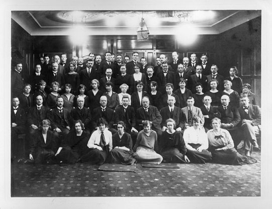 Personalen vid frimärkstryckeriet i Centralposthuset i plenisalen omkring 1920-27.