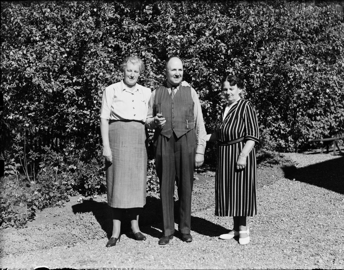 Man och två kvinnor står på grusgång, Östhammar, Uppland