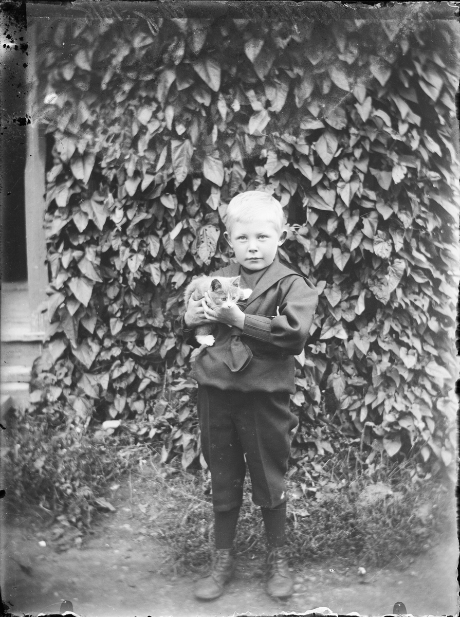 Pojke håller en kattunge i famnen, Harg, Uppland