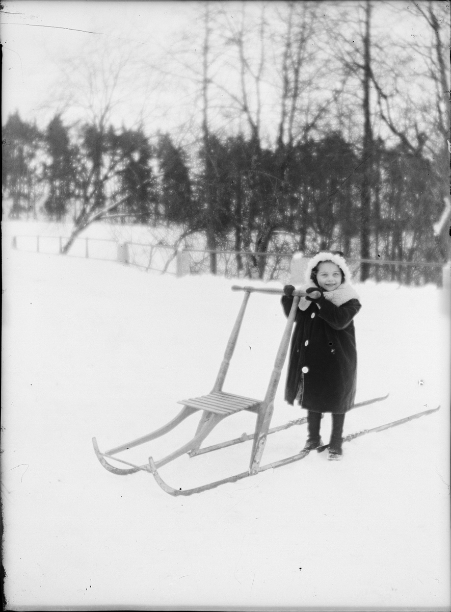 Liten flicka står med en sparkstötting, Östhammar Uppland