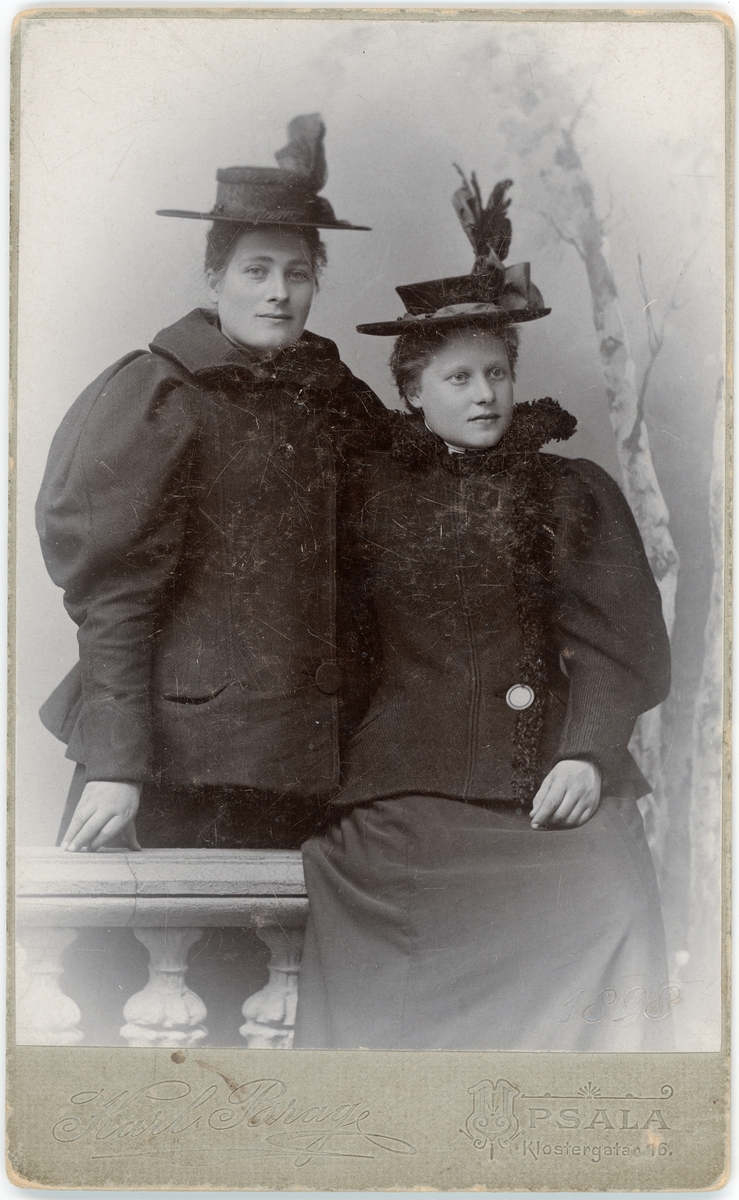 Kabinettsfotografi - två kvinnor i ytterkläder och hatt, Uppsala 1898