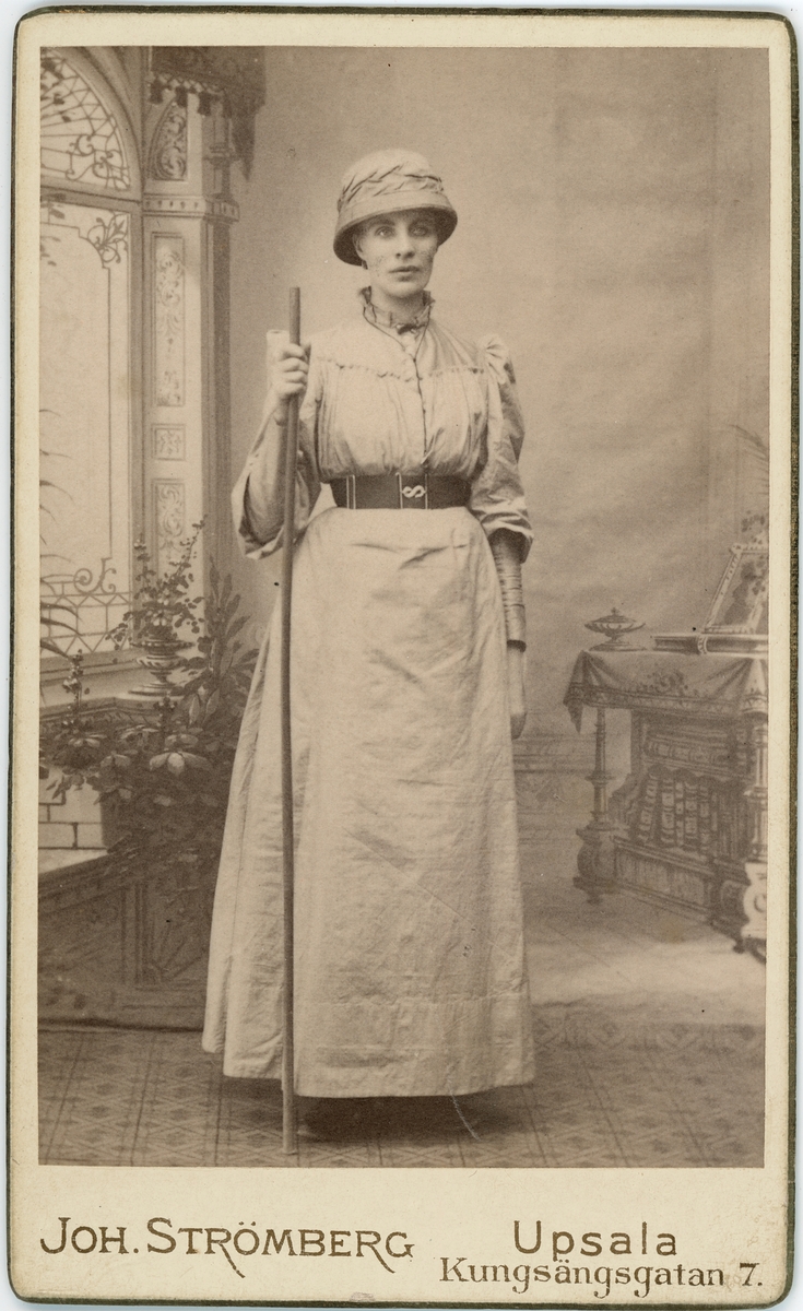Kabinettsfotografi - kvinna med hatt och en vandringsstav i handen, Uppsala