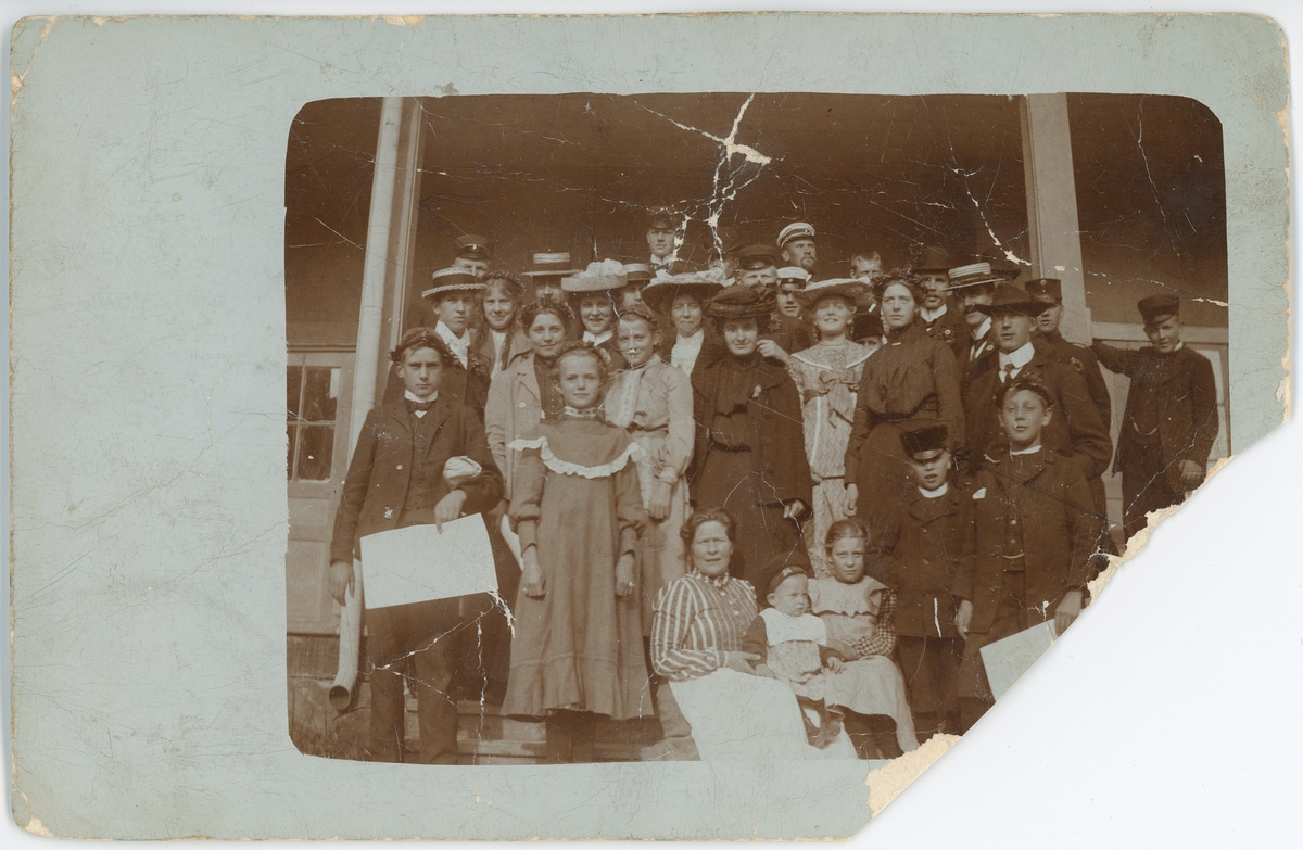 Kvinnor, män och barn på trappa till byggnad, Uppsala