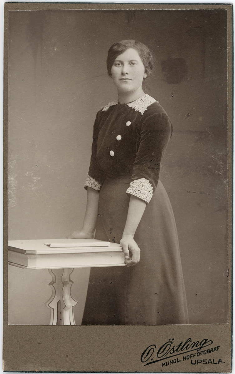 Kabinettsfotografi - kvinna vid ett bord, Uppsala 1915