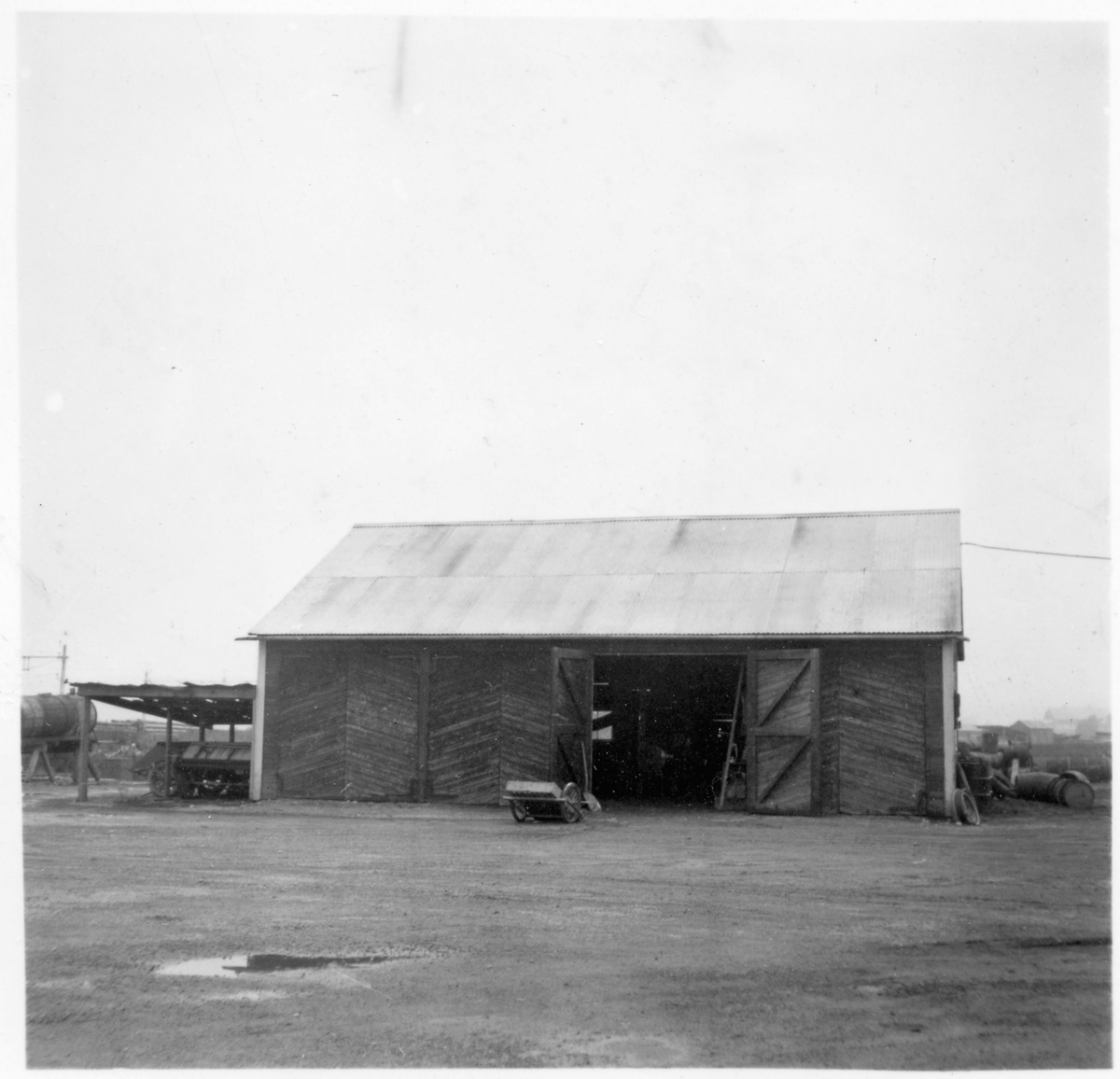 Vägstation D7, Jönåker. Förrådsbyggnad (troligtvis äldre garagebyggnad). Framför byggnaden en cykelkärra. Till vänster luttunna. Diverse upplag av bränslefat m.m.