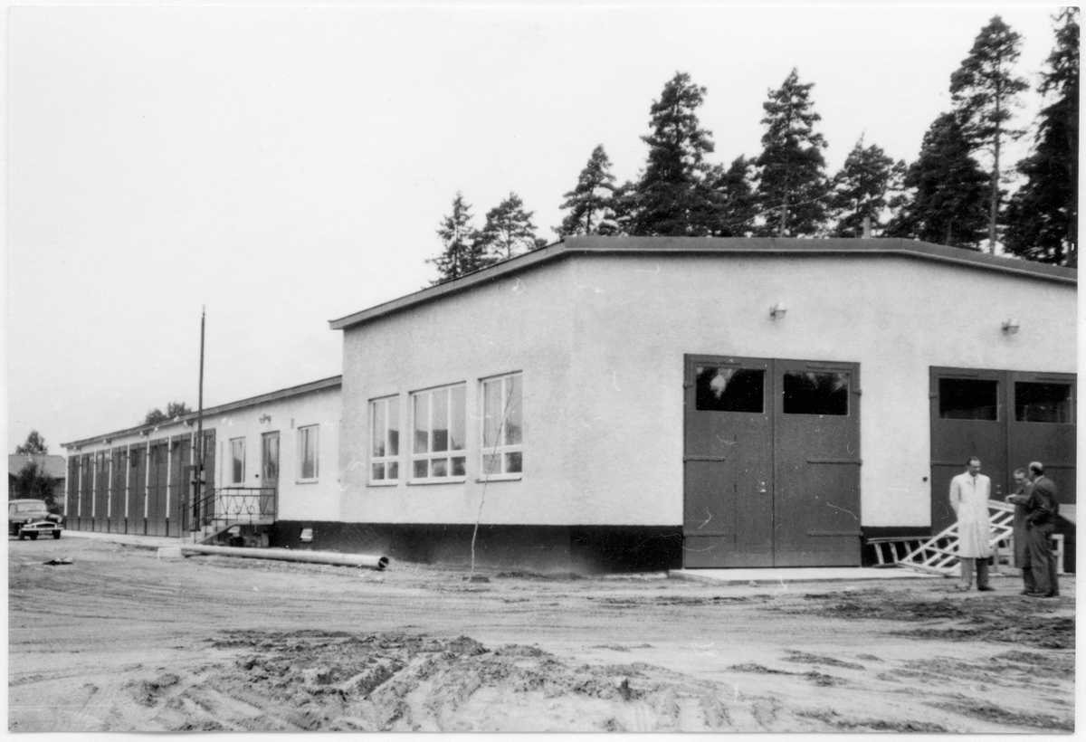 Vägstation R1, Mullsjö. Vägstationens huvudbyggnad, nybyggd, markberedning pågår. Från vänster garage, kontor, verkstad. Trappan upp till kontoret med smidesräcke med smidd text "VoV". Under 1950- och 1960-talet fick många nybyggda vägstationer dessa räcken. Personbil på garageplan, tre manspersoner vid gaveln. Portar till verkstaden på gaveln.