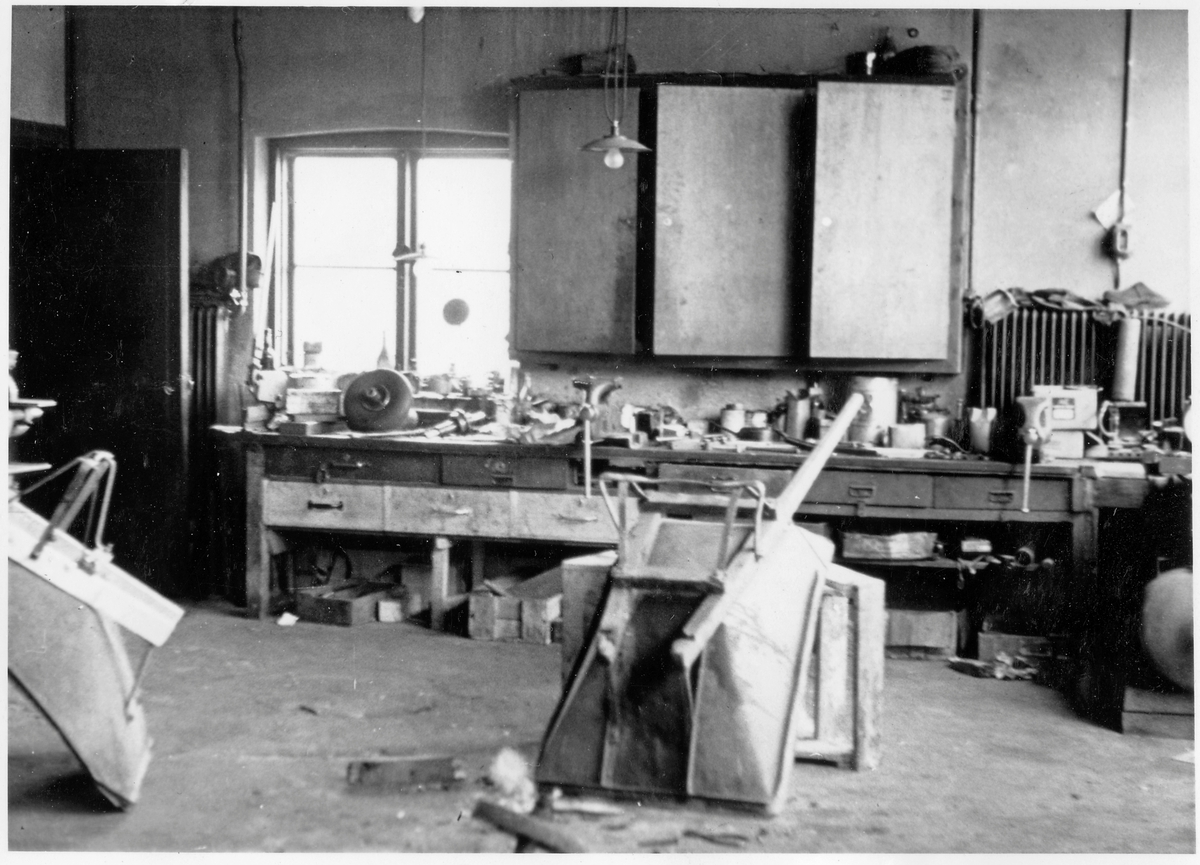 Vägstation F10, Tranås. Interiör av verkstaden. Arbetsbänk med olika handverktyg. Skottkärror under reparation.