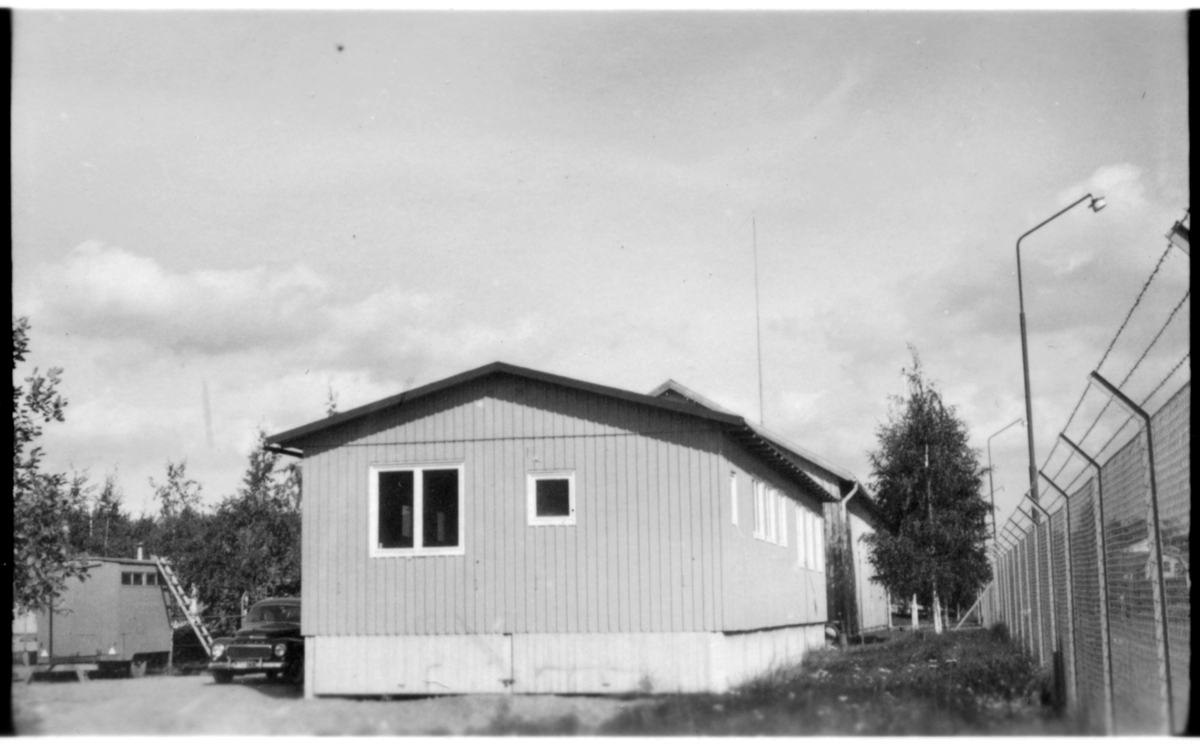 Vägstation D5, Flen. Byggnad, troligen kontorsbyggnad. Manskapsvagn och Volvo PV.