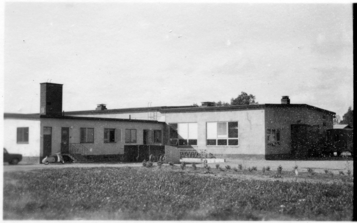 Vägstation D5, Flen. Vägstationens huvudbyggnad med Länsverkstadsdelen till höger. Smidesräcke med smidd text "VoV". Cykelställ med cyklar. "Vespa" framför ingången.