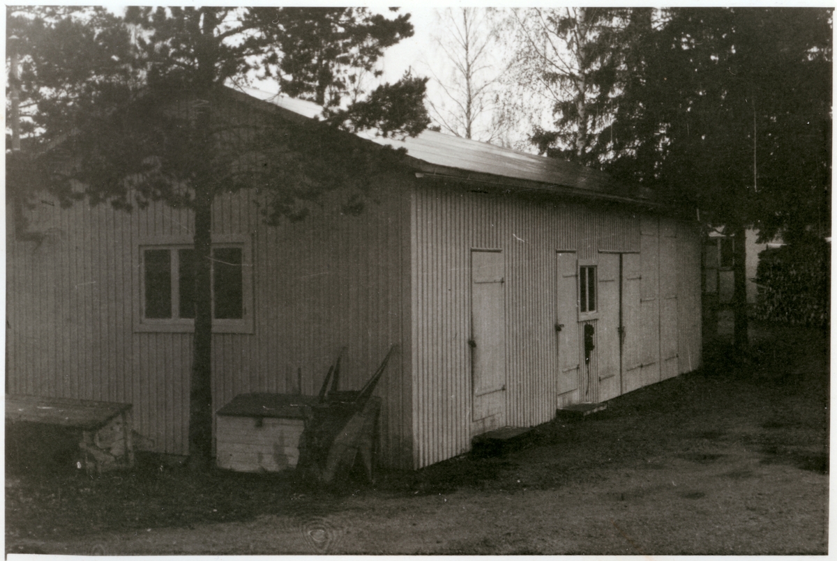 Vägstation Vmo B1, Östhammar. Förrådsbyggnad. Vid gaveln redskapslådor, skottkärra.
