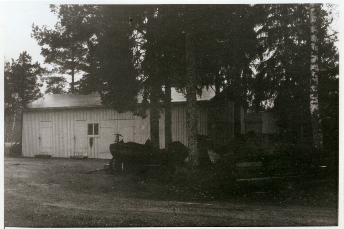 Vägstation Vmo B1, Östhammar. Förrådsbyggnad. Slåttermaskin, spetsplog framför.