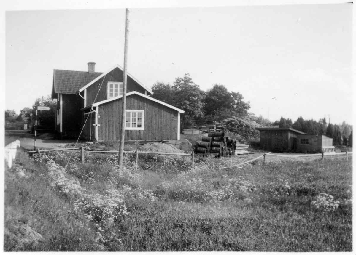 Vägstation B3 Söderby-Karl. Filial Häverödal. Vägstationens huvudbyggnad med eventuell kontorsdel. Invid väg. Bränslefat på baksidan.