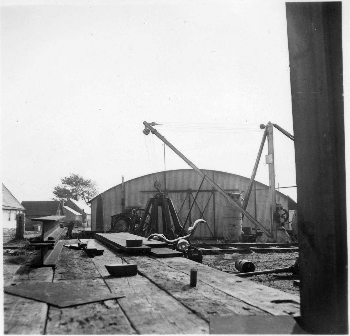 Barsebäck, varvet. Kajanläggning och olika förrådsbyggnader och materielupplag. Lyftkranar.