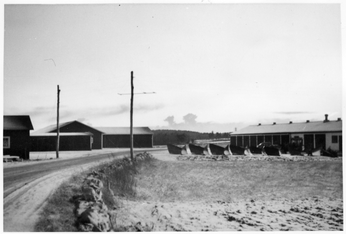 Vägstation L5, Broby. Vy från väg mot vägstationen, med garagebyggnad, med spetsplogar framför.