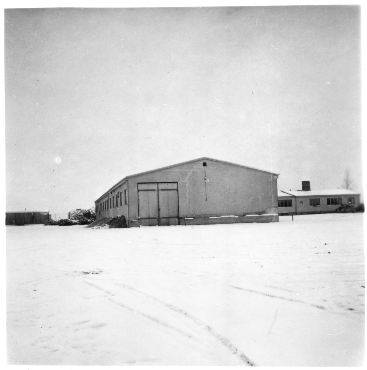 Vägstation M7, Dalby. Garagebyggnad, baksidan och ena gaveln. Till höger skymtar byggnaden med förråd och kontor.