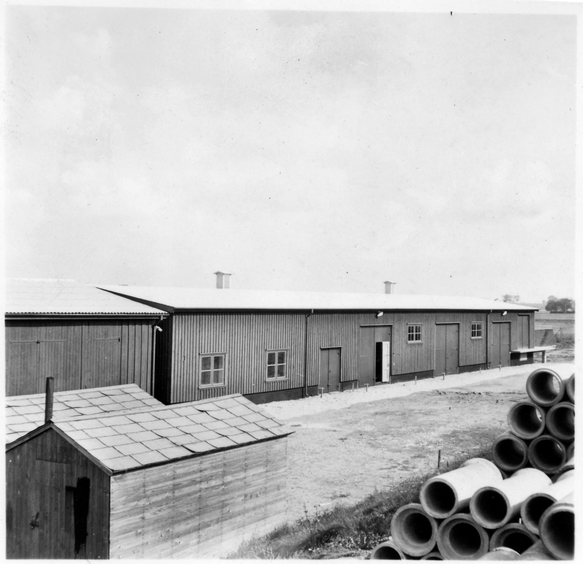Vägstation M11, Södervidinge. Förrådsbyggnader, tillhörande Vägförvaltningen i Malmöhus län, VFM:s depåförråd. I förgrunden muffrör av cement.