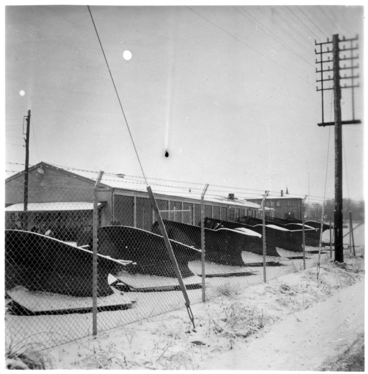 Vägstation M11, Södervidinge. Garagebyggnad, innanför nätstängsel. Uppställda spetsplogar. I bakgrunden bostadshus och spiran på ett kyrktorn.