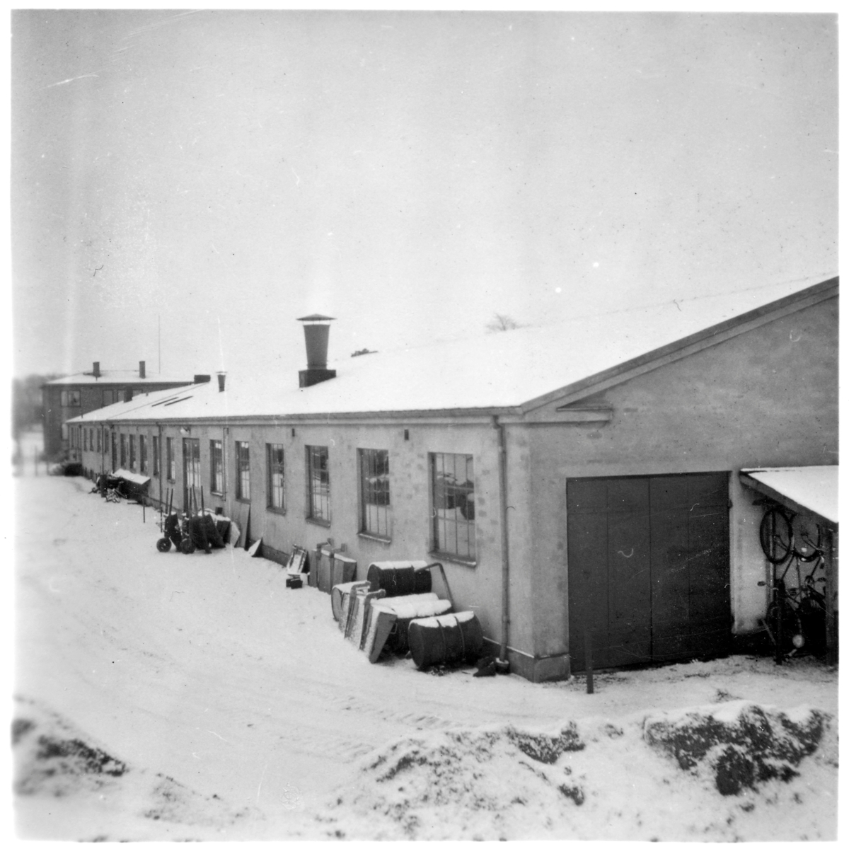 Vägstation M11, Södervidinge. Garagebyggnad, baksida. Diverse material, bland annat skottkärror. På gaveln cykelställ med cyklar.