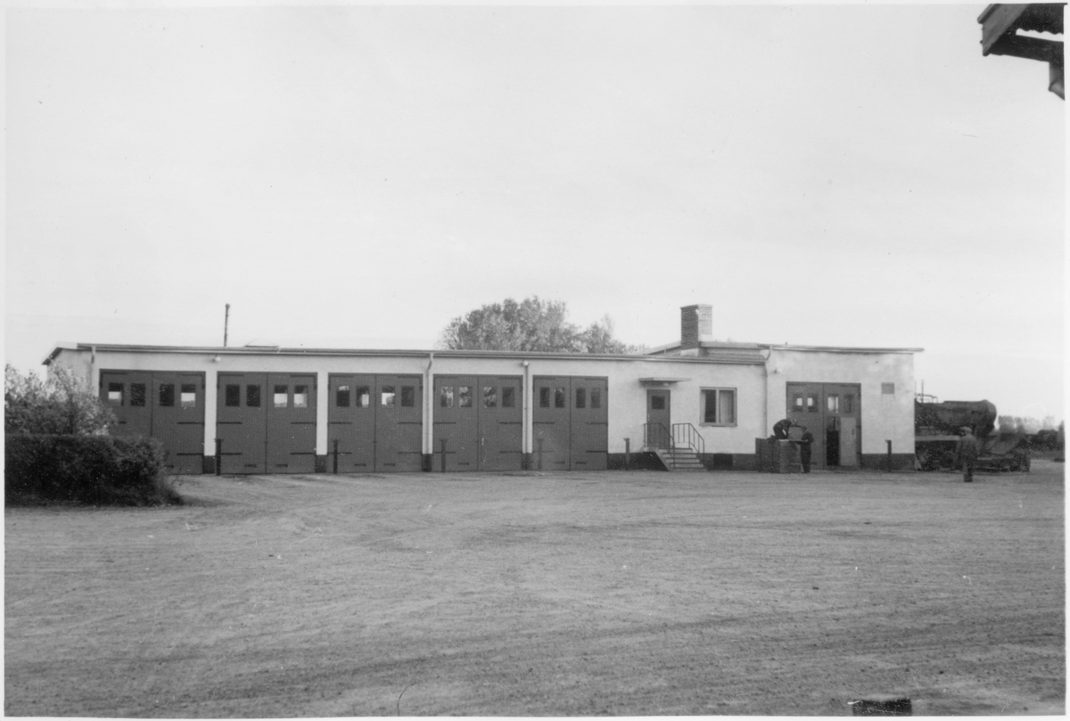 Vägstation N1, Hov. Byggnad med från vänster garagedel, kontorsdel, verkstadsdel. Manspersoner utanför verkstaden.