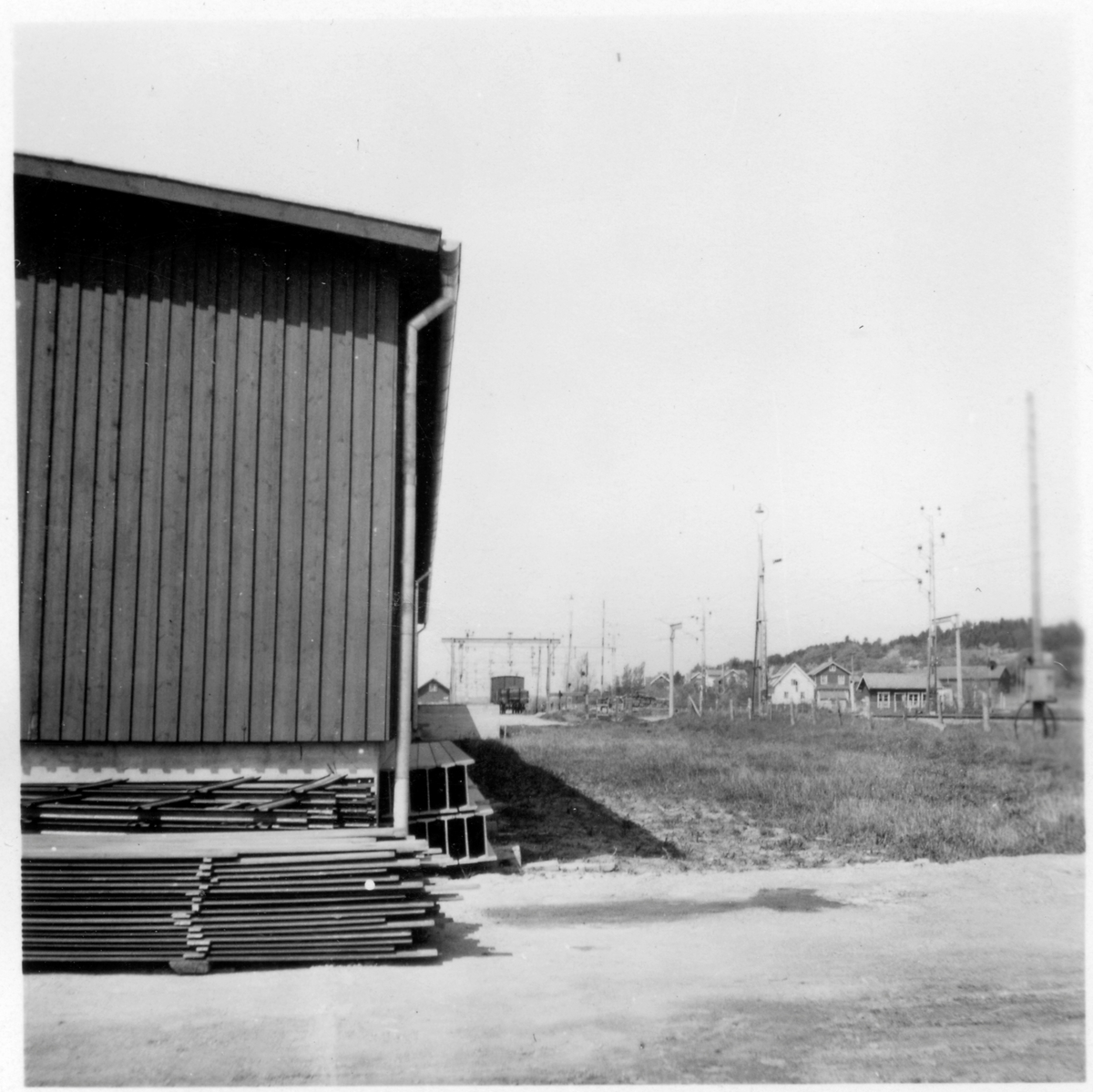 VFO, Depåförrådet. Förrådsbyggnad. Bakom förrådet elektrifierad järnväg.