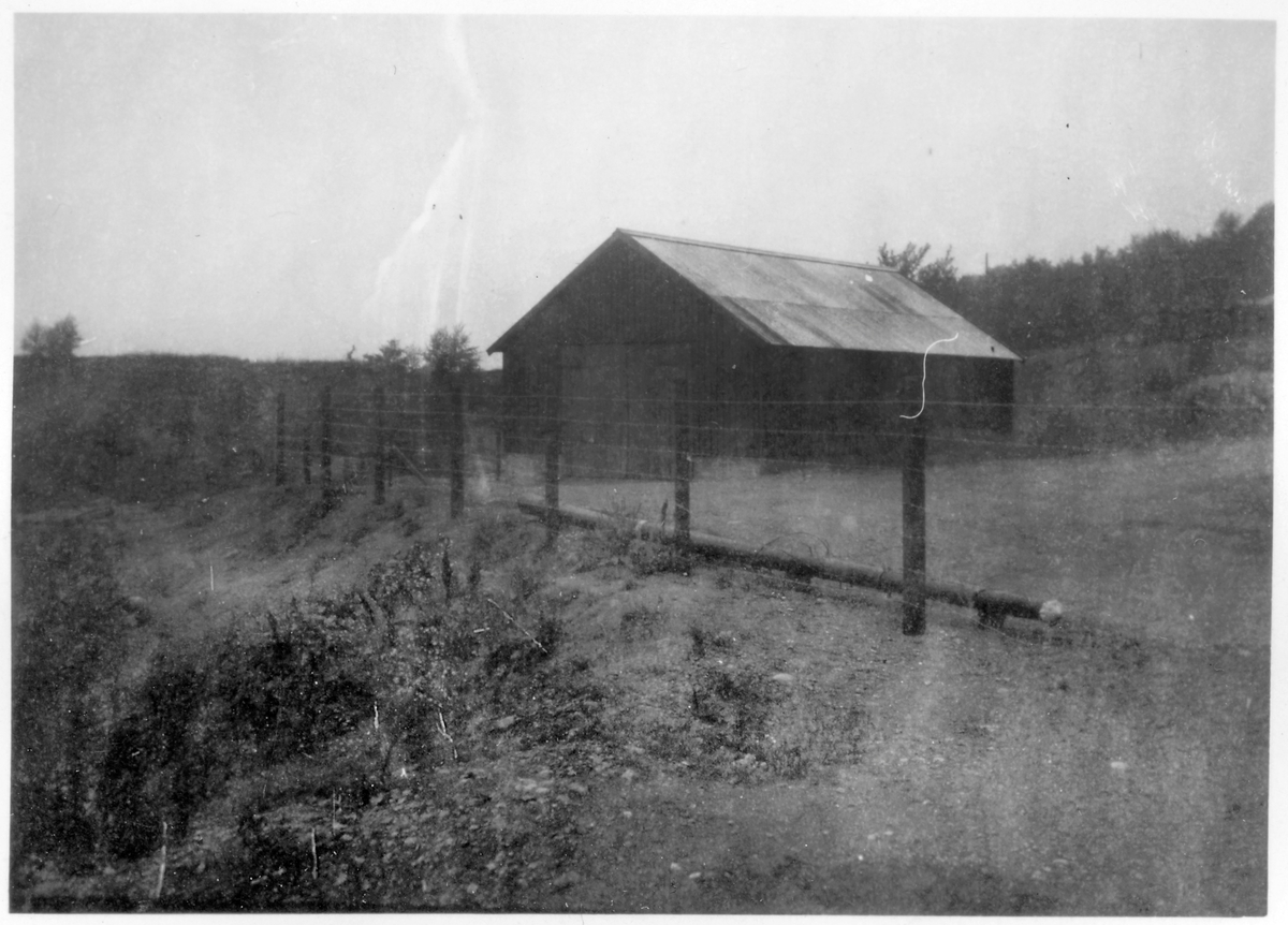 Vägstation O1b, Säve. Förrådsbyggnad innanför stängsel.