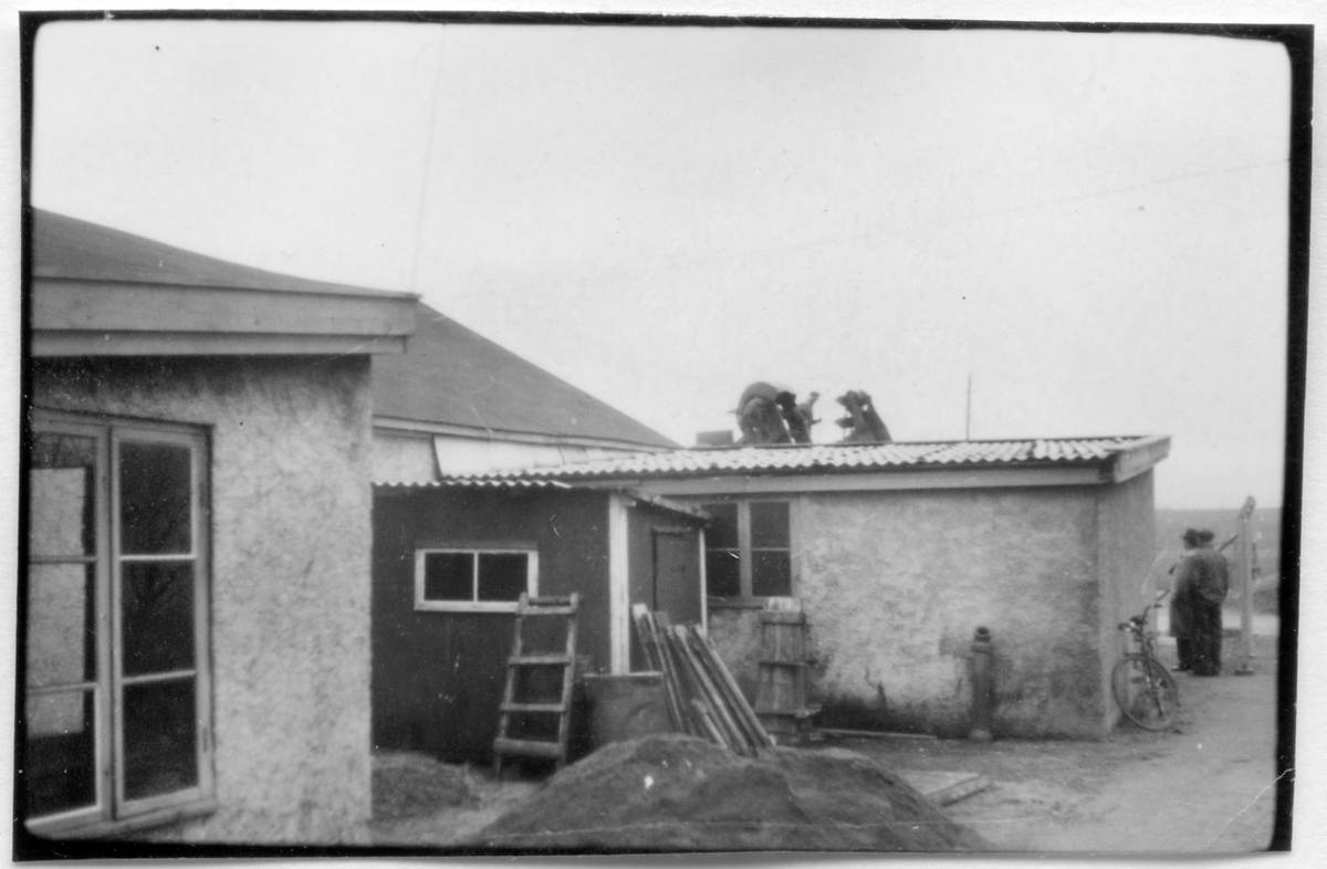 Vägstation O2, Stora Höga. Baksidan av kontorsbyggnaden, med mindre förrådsbyggnad. Cykel lutad mot gaveln. Manspersoner vid sidan av byggnaden.