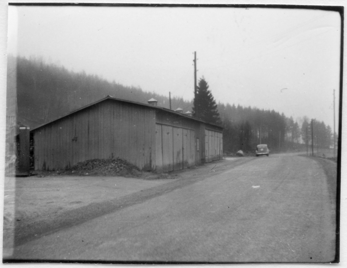 Vägstation O2, Stora Höga, filial Kastellet. Garagebyggnad. Invid väg. Bensinpump (drivmedelspump) vid gaveln.