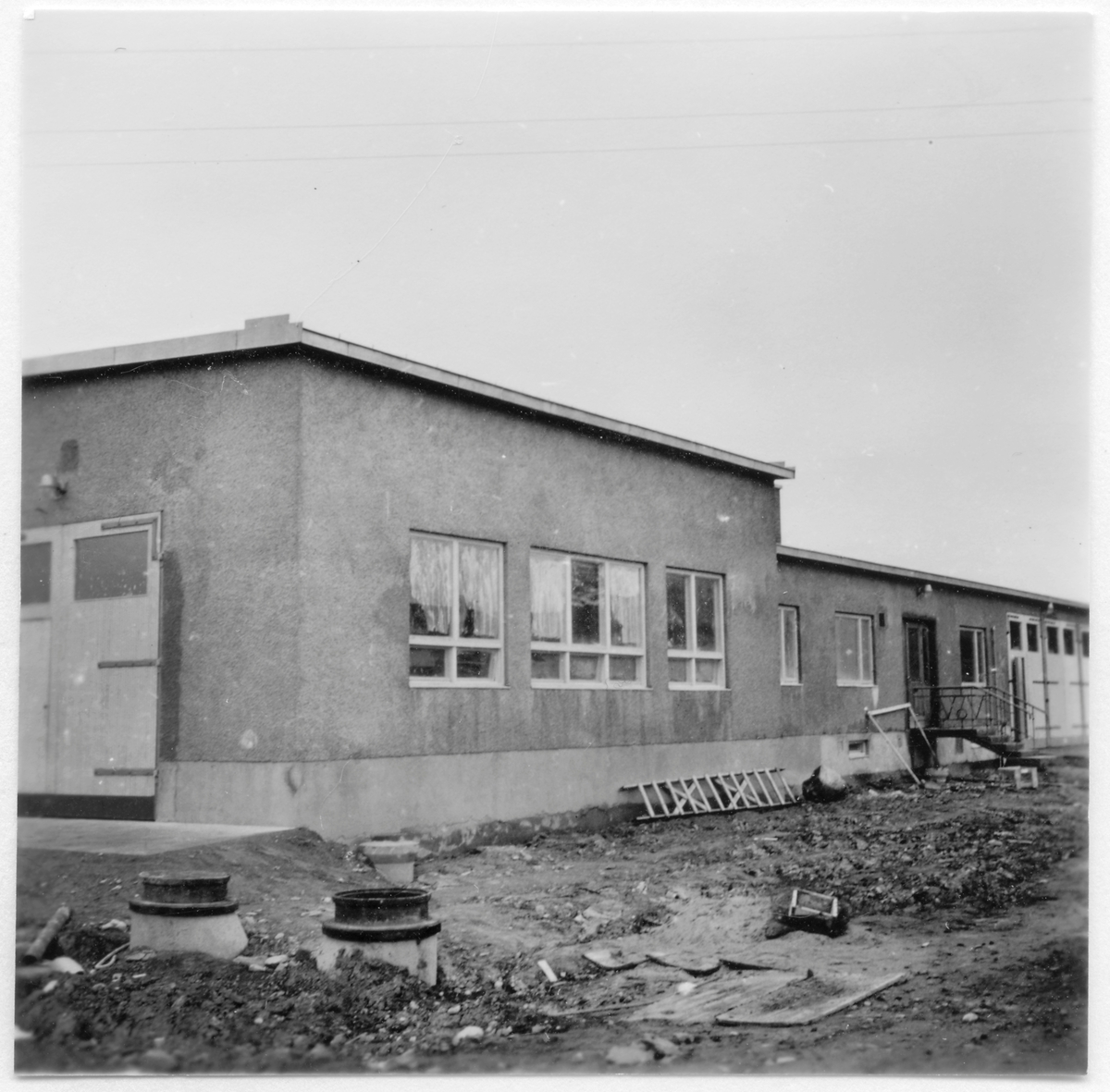 Vägstation O3, Skårby. Vägstationens huvudbyggnad med verkstad, kontor och garage. Byggandet av ny vägstation. På trappan till kontorsdelen smidesräcke med smidd text "VoV".