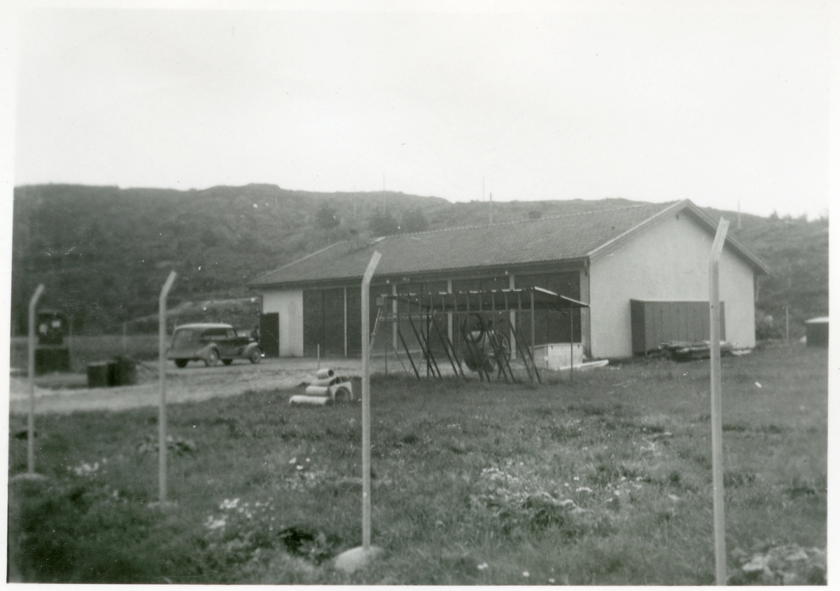 Vägstation O4, Henån, filial Kållekärr. Garagebyggnad. Cykelställ med cyklar, välttrumma framför garaget. På gavel manskapsskåp för manskapets personliga utrustning och redskap. Personbil framför byggnaden.