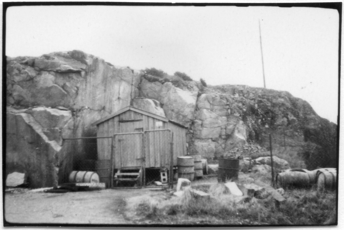 Vägstation O6, Naverstad, filial Kville. Förrådsbyggnad, nedanför klippkant. Upplag av bränsletunnor runtomkring.