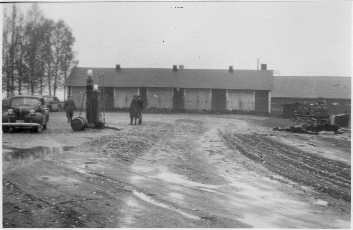 Vägstation Z14, Strömsund. Garageplan med garagebyggnad i bakgrunden. Bensinpumpar (drivmedelpumpar), två personbilar, manspersoner.