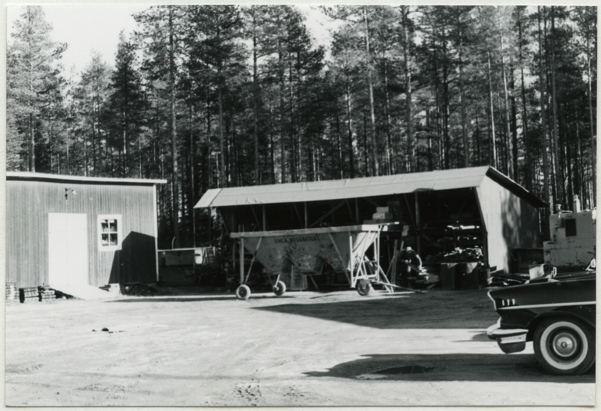 Vägstation AC4, Vännäs. Förrådsbyggnader. Betongvagn, för byggnadsarbete. Personbil skymtar till höger.