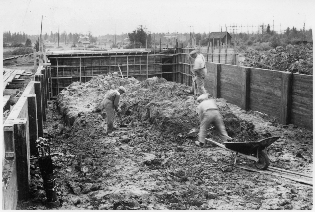 Depåförråd VFAC (Vmo AC4, Vännäs). Byggande av depåförrådet. Till vänster jordstöt, Johnson Superrammer.
