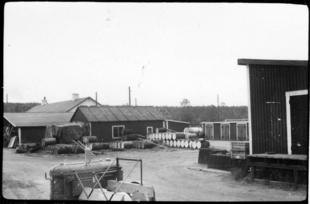 Vägstation AC5, Vindeln. Förrådsbyggnad. I förgrunden stationär motor (ombyggd traktor). Till vänster släpskopa. Upplag av bränslefat.