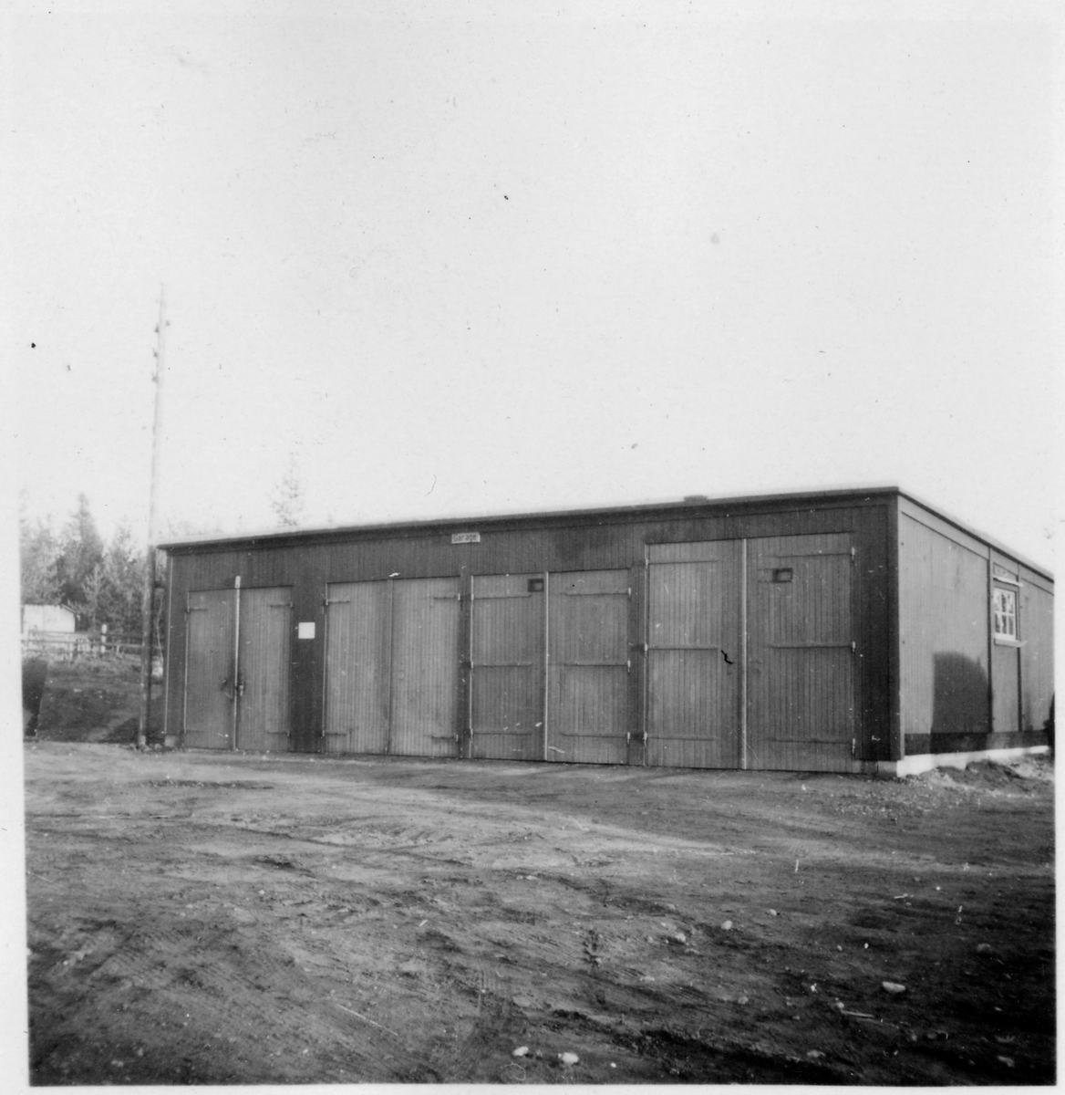Vägstation BD 15, Gällivare, filial Dokkas. Garagebyggnad. Ovanför garageportarna skylt "Garage".