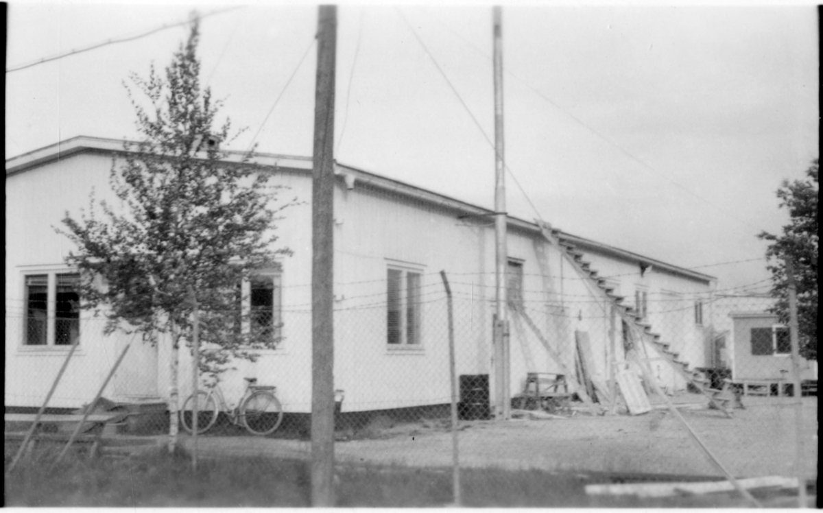 Vägstation BD2, Älvsbyn. Byggnad, troligen kontors- och förrådsbyggnad. Ombyggnadsarbeten pågår. Cykel vid gaveln. Manskapsvagn i bakgrunden.