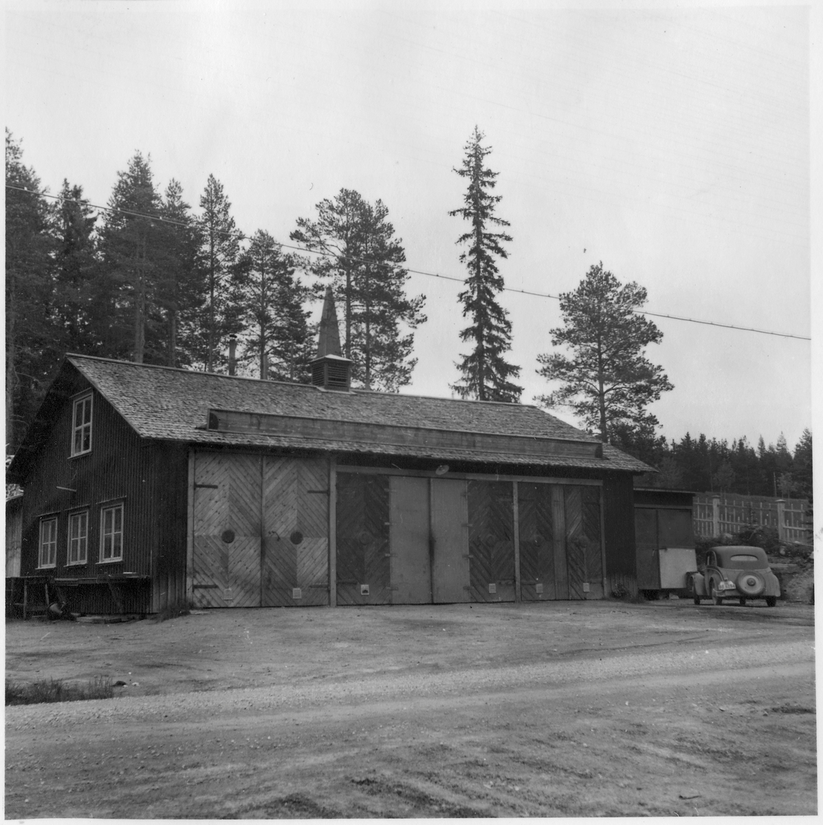 Vägstation BD5, Harads. Äldre garagebyggnad. Personbil framför garageporten.