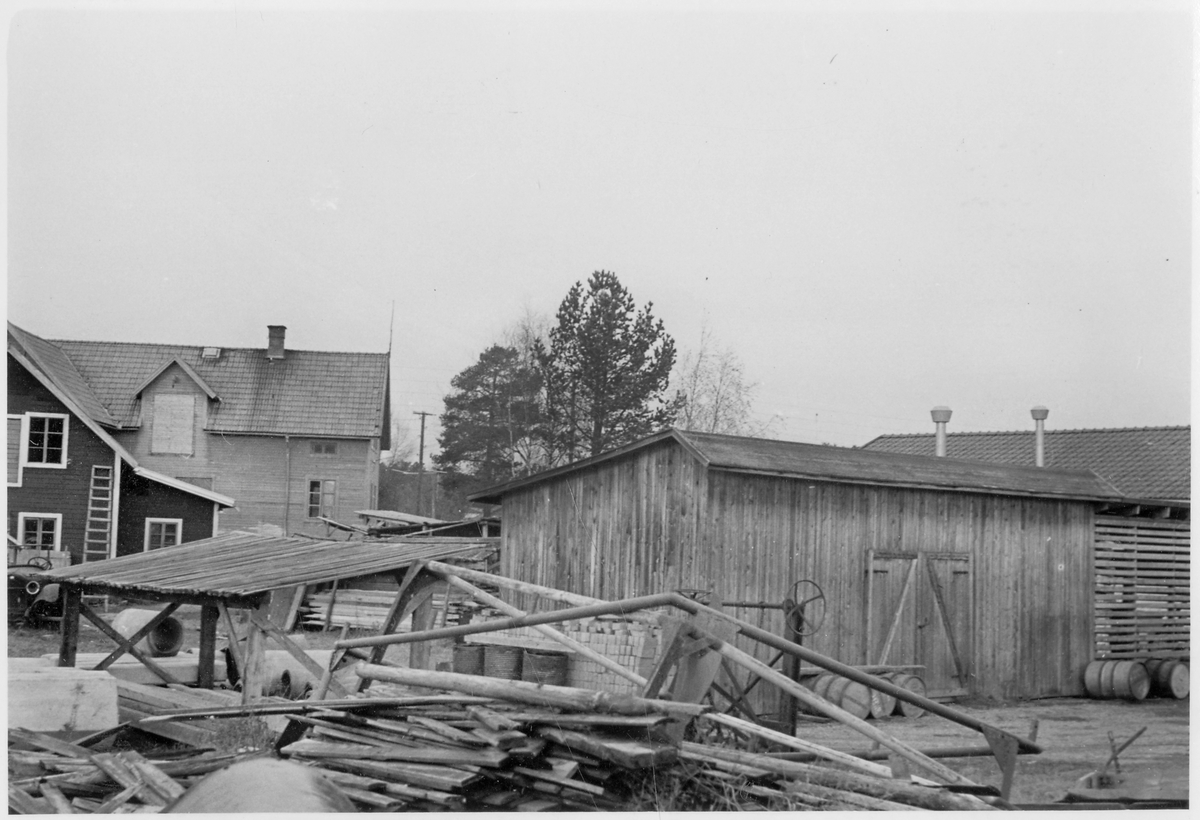 Vägstation Z5, Sveg, filial Ytterhogdal. Förrådsbyggnader. Upplag av trävirke, bränslefat. Vägsladd. Bostadshus i bakgrunden.