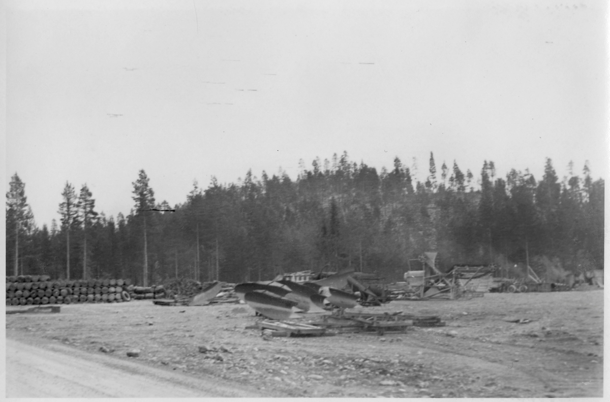 Vägstation Z6, Hede. Upplag av diverse material och väghållningsmaskiner invid väg, bland annat spetsplogar, sidoplogar, grussorteringsverk, vägsladd, bränslefat.