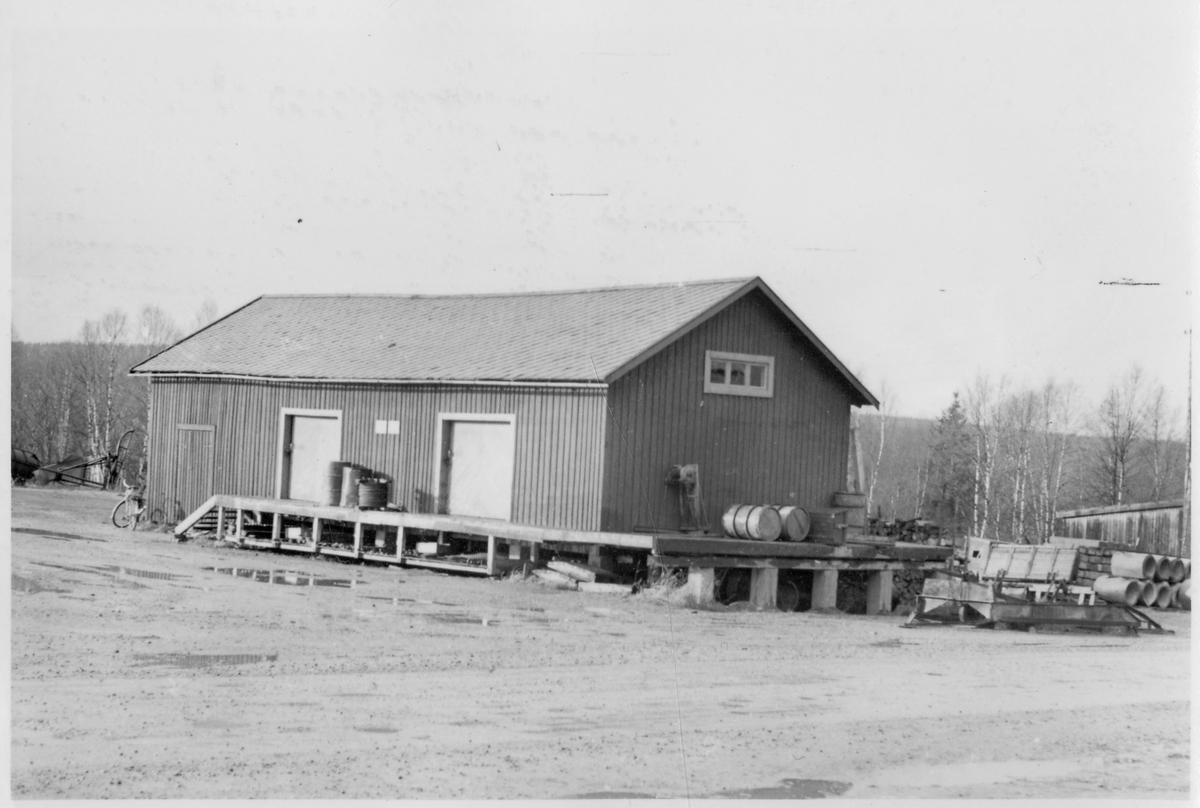 Vägstation Z6, Hede, filial Funäsdalen. Förrådsbyggnad med lastbrygga. Upplag av diverse material och väghållningsmaskiner, bland annat vägsladd, sidoplogar. Cykel vid gaveln.