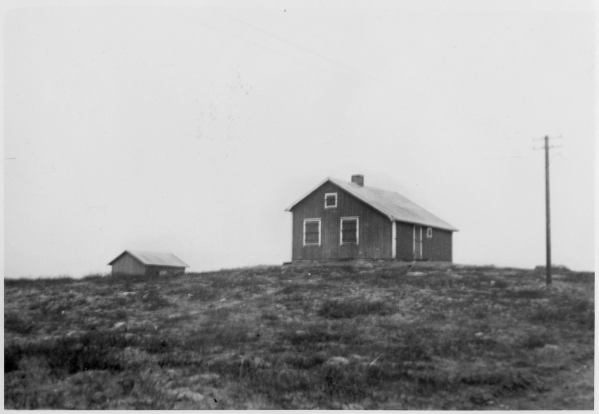 Vägstation Z6, Hede, filial Flatruet. Byggnad på kalfjället. Troligen övernattningsstuga för manskapet. Garagebyggnad till vänster. Telefonstolpe.