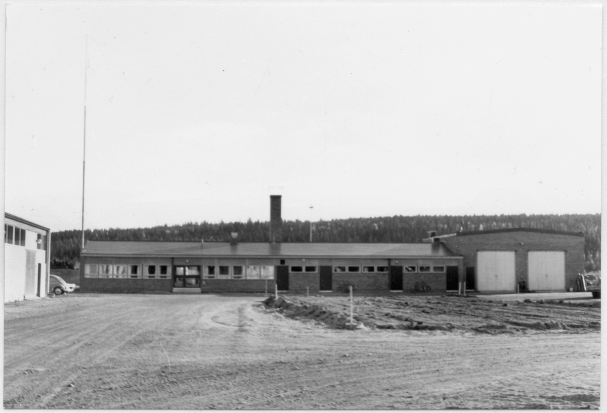 Vägstation AC5, Vindeln. Vägstationens huvudbyggnad med kontor, förråd och verkstad. Radiokommunikationsmast vid gaveln. Vägstationen under uppförande, markberedning av garageplan pågår.