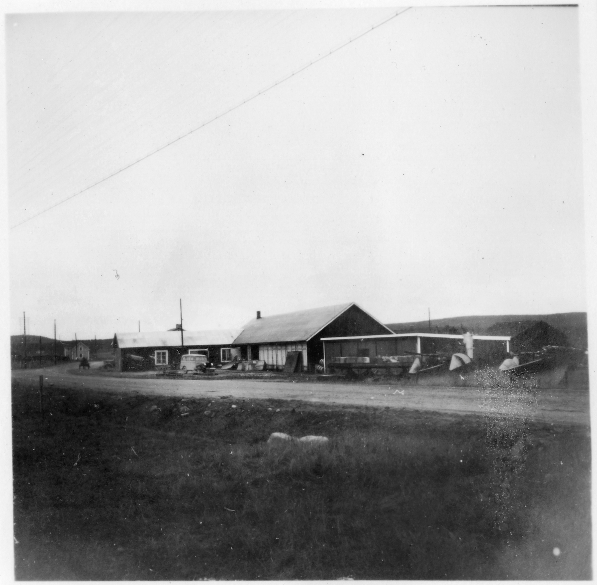 Vägstation BD10, Övertorneå. Förråds- och garagebyggnad byggd i vinkel. Runt byggnaderna olika väghållningsmaskiner, bland annat spetsplogar, sidoplogar. Personbil. Invid väg, med häst och kärra på vägen. Bostadshus i bakgrunden.