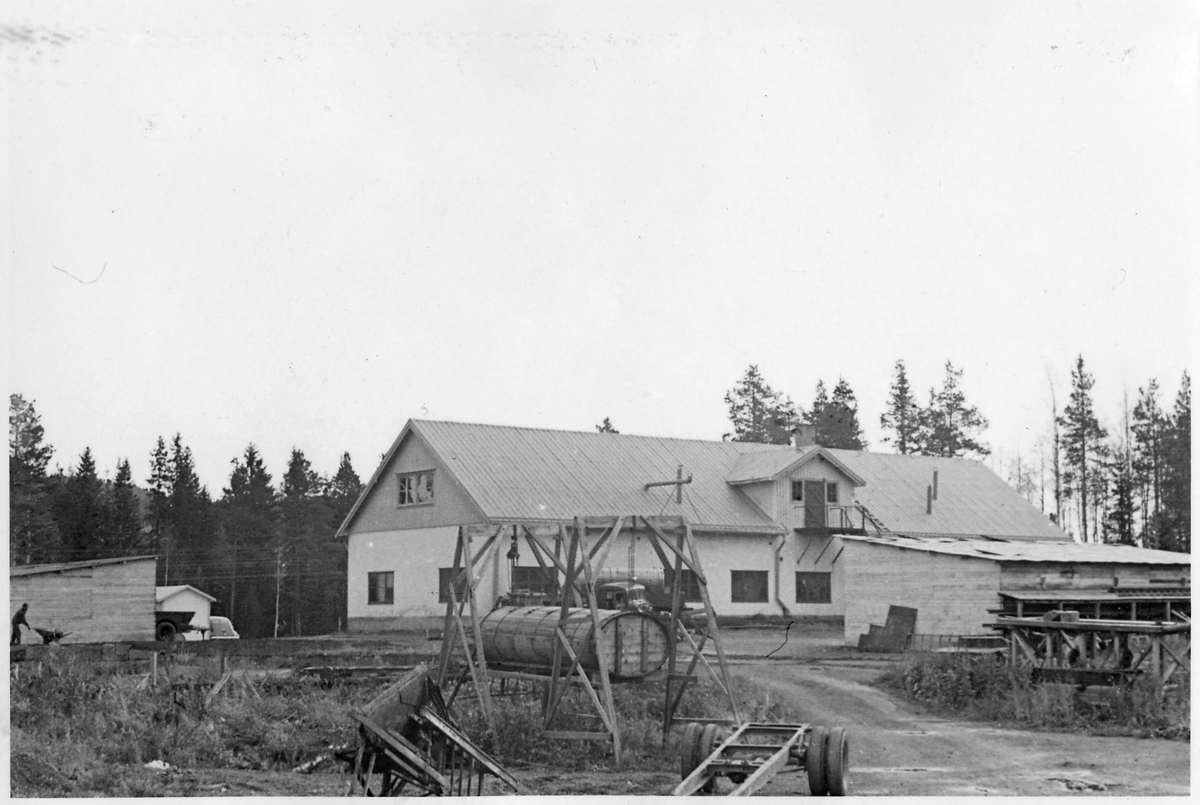 Vägstation Z4, Svenstavik. Vägstationens huvudbyggnad (baksidan) med verkstad, förråd och garage. På planen diverse material och väghållningsmaskiner, bland annat grusspridare, luttunna på bockar, under vinsch, underrede till släpkärra.