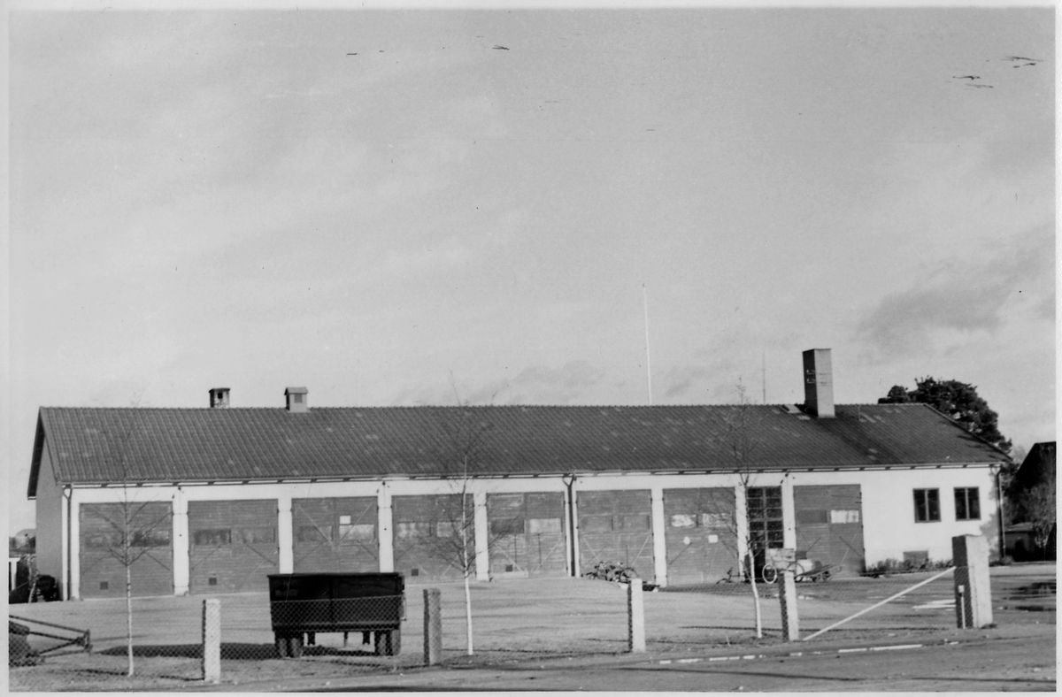 Vägstation Z5, Sveg. Vägstationens huvudbyggnad med garage och verkstad. På garageplan sandspridare. Cyklar mot garageväggen. Lågt nätstängsel. Invid väg.