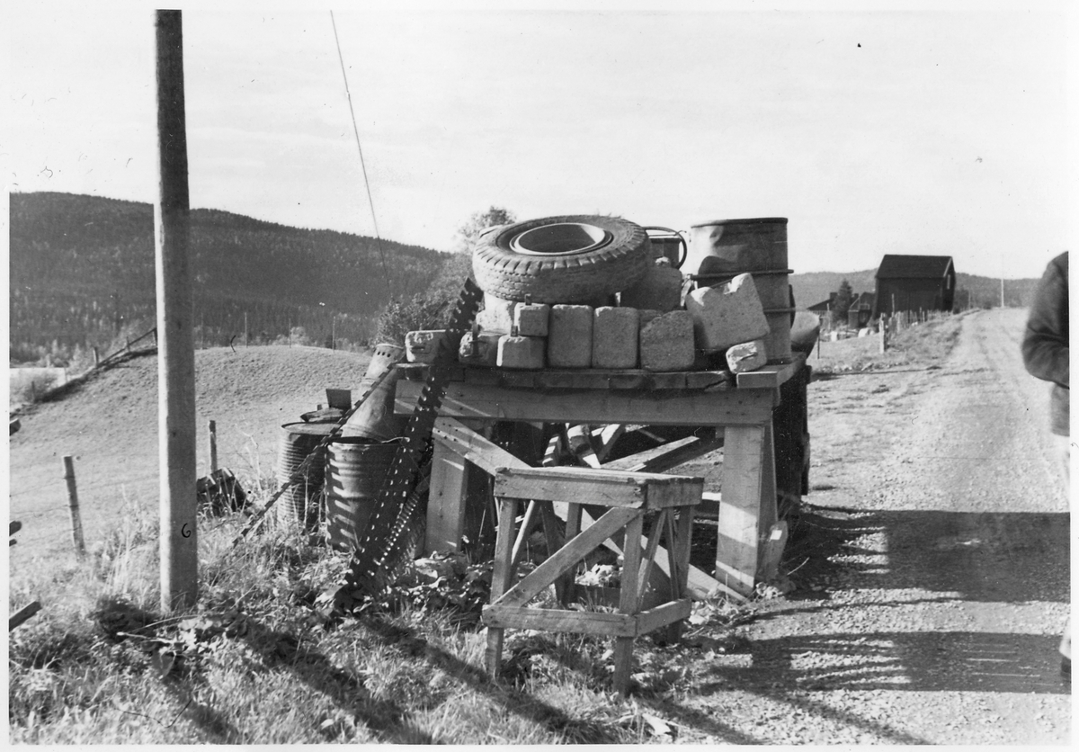 Vägstation Z7, Järpen, filial Duved. "Mjölkpall/Mjölkbord" invid väg med upplag av diverse materiel, bland annat väghyvelstål, bildäck.