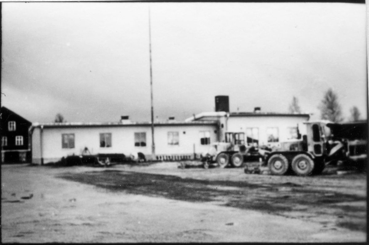 Vägstation Vmo X5, Edsbyn. Byggnad med kontorsdel. Väghyvlar framför byggnaden.