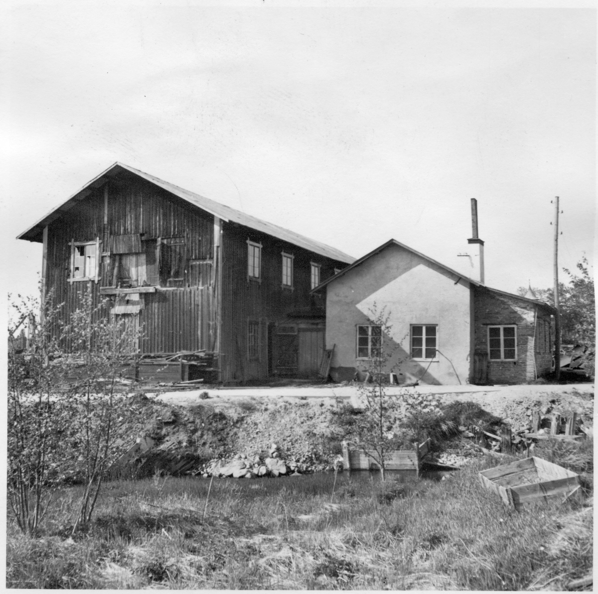 Vägstation Vmo X3, Söderala. Två sammanbyggda förrådsbyggnader. Byggnad till höger med reveterad fasad, eventuellt smedja.